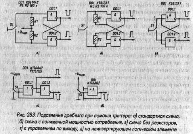 В цифровых устройствах на микросхемах большую роль играют различные формирователи импульсов - от кнопок и переключателей, из сигналов с пологими фронтами, дифференцирующие цепи, а также мультивибраторы. В данном разделе книги рассмотрены некоторые вопросы построения таких формирователей и генераторов на микросхемах серий КМОП. Как известно, непосредственная подача сигналов от механических контактов на входы интегральных микросхем допустима не всегда изза так называемого "дребезга" - многократного неконтролируемого замыкания и размыкания контактов в момент их переключения. Если входы, на которые подается сигнал, нечувствительны к дребезгу, например входы установки триггеров и счетчиков, непосредственная подача сигналов допустима (рис. 282). Подача сигналов на счетные входы требует специальных мер по подавлению дребезга, без них возможно многократное срабатывание триггеров и счетчиков.