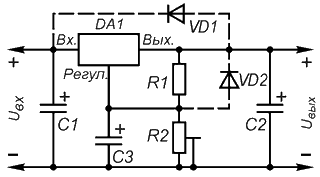Обратим внимание на то, что, в отличие от стабилизаторов на фиксированное выходное напряжение, регулируемые без нагрузки не работают. Минимальное значение выходного тока маломощных регулируемых стабилизаторов равно 2,5...5 мА и 5...10мА - мощных. В большинстве случаев применения нагрузкой служит резистивный делитель напряжения R1 R2 на рис. 3. | ||||||||||||||||||||||||||||||||||||||||||||||||||||||||||||||||||||||||||||||||||||||||||||||||||||||||||||||||||||||||||||||||||||||||||||||||||||||||||||||||||||||||||||||||||||||||||||||||||||||||||||||||||||||||||||||||||||||||||||||||||||||||||||||||||||||||||||||||||||||||||||||||||||||||||||||||||||||||