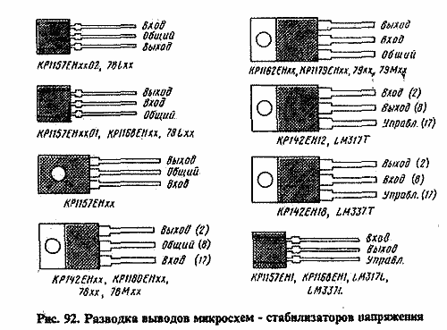 Одним из важных узлов любой радиоэлектронной аппаратуры является стабилизатор напряжения питания. Еще совсем недавно такие узлы строились на стабилитронах и транзисторах. Общее число элементов стабилизатора было довольно значительным, особенно, если от него требовались функции регулировки выходного напряжения, защиты от перегрузки и короткого замыкания, ограничения выходного тока на заданном уровне. С появлением специализированных микросхем ситуация изменилась. Современные микросхемы стабилизаторов напряжения выпускаются на широкий диапазон выходных напряжений и токов, они имеют встроенную защиту от перегрузки по току и от перегрева - при нагреве кристалла микросхемы свыше допустимой температуры она закрывается и ограничивает выходной ток. В табл. 2 приведен перечень наиболее распространенных на отечественном рынке микросхем линейных стабилизаторов напряжения на фиксированное выходное напряжение и их некоторые параметры, на рис. 92 - разводка выводов. Буквы хх в обозначении конкретной микросхемы заменяются на одну или две цифры, соответствующие напряжению стабилизации в вольтах, для микросхем серии КР142ЕН - на цифробуквенный индекс, указанный в таблице. Микросхемы зарубежных изготовителей серий 78хх, 79хх, 78Мхх, 79Мхх, 78Lxx, 79Lxx могут иметь различные префиксы (указывают фирму-изготовитель) и суффиксы, определяющие конструктивное оформление (оно может отличаться от приведенного на рис. 92) и температурный диапазон. Следует иметь ввиду, что сведения о рассеиваемой мощности при наличии теплоотвода в паспортных данных обычно не указаны, поэтому здесь даны некоторые усредненные величины из графиков, приведенных в документации. Отметим также, что для микросхем одной серии, но на разные напряжения, значения рассеиваемой мощности могут также отличаться друг от друга. Более подробные сведения о некоторых сериях отечественных микросхем можно найти в литературе [10 - 14]. Исчерпывающая информация по микросхемам для линейных источников питания опубликована в [15].