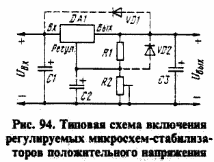 Принципиально по схеме рис. 94 можно включать и микросхемы с фиксированным выходным на пряжением, но их собственный ток потребления значительно больше (2...4 мА) и он менее стабилен при изменении выходного тока и входного напряжения.