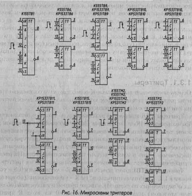 Основу последовательностных цифровых структур составляют триггеры различных типов, которые могут использоваться самостоятельно или в составе счетчиков, регистров и т. д. Триггеры ТТЛ-микросхем различаются по своим возможностям. Так называемые JK- и D-триггеры ТМ2 могут работать в счетном режиме, то есть менять свое состояние на противоположное на каждый импульс, приходящий на счетный вход триггера. Триггеры других микросхем могут работать только в режиме хранения информации, записываемой в них в момент подачи тактовых импульсов. На рис. 16 приведены графические обозначения описываемых далее триггеров. Триггер К155ТВ1 имеет девять входов: R - установки в 0, S - установки в 1, С - тактовых импульсов, J и К - управляющие (по три входа, объединенных по схеме И), а также прямой и инверсный (обозначен кружком) выходы. При подаче лог. 0 на вход R триггер устанавливается в нулевое состояние, при котором на прямом выходе лог. 0, на инверсном - лог. 1. При подаче лог. 0 на вход S триггер устанавливается в единичное состояние. При подаче лог. 0 одновременно на оба входа (R и S) триггера на обоих выходах появляется лог. 1. Состояние триггера после снятия лог. 0 со входов R и S определяется тем, с какого из входов лог. 0 снят последним. Аналогично управляются по входам R и S все описываемые далее триггеры ТТЛ. Сложнее происходит работа триггера при подаче сигналов на входы С, J и К. Наиболее простой режим - при лог. 1 на входах J и К. В этом случае JK-триггер работает, как обычный триггер со счетным входом: по спаду каждого положительного импульса на тактовом входе С состояние триггера меняется на противоположное. Если хотя бы на одном входе J и на одном входе К одновременно лог. 0, состояние триггера при подаче импульсов по тактовому входу С не меняется. Если на всех входах J лог. 1, хотя бы на одном входе К - лог. 0, по спаду положительного импульса на входе С триггер устанавливается в единичное состояние независимо от своего предыдущего. Если хотя бы на одном входе J лог. 0, на всех входах К - 1, по спаду импульса на входе С триггер устанавливается в нулевое состояние. Изменение сигналов на J- и К-входах при лог. 0 на входе С не влияет на состояние JK-триггера. Если же на входе С лог. 1, изменение сигналов на J- и К-входах само по себе не влияет на состояние выходов, но запоминается. Если триггер находится в нулевом состоянии и во время действия положительного тактового импульса на всех входах J была кратковременно лог. 1, по спаду импульса положительной полярности триггер перейдет в единичное состояние независимо от состояния входов J и К на момент спада. Аналогично, если триггер находится в единичном состоянии и во время действия тактового импульса на всех входах К была кратковременно лог. 1, по спаду тактового импульса триггер перейдет в нулевое состояние независимо от состояния входов J и К. Предельная частота работы триггера К155ТВ1 10 МГц. Микросхема ТВ6 (рис. 16) - сдвоенный JK-триггер. Каждый триггер имеет вход для подачи тактовых импульсов С, входы для подачи информации J и К, вход сброса R. Приоритетом пользуется вход R -при подаче на него лог. 0 триггер устанавливается в нулевое состояние, при котором на прямом выходе триггера - лог. 0, на инверсном -лог. 1. При лог. 1 на входе R возможна запись информации со входов J и К. Переключение триггера происходит по спаду импульсов положительной полярности на