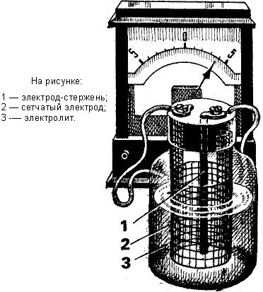 Это был герметично закрытый сосуд с двумя медными электродами, наполненный раствором цианида калия. Кистяковский заметил, что если сосуд попеременно наклонять то в одну, то в, другую сторону и таким образом изменять площадь погружения каждого из электродов, то в получившейся среде возникает электрический ток.