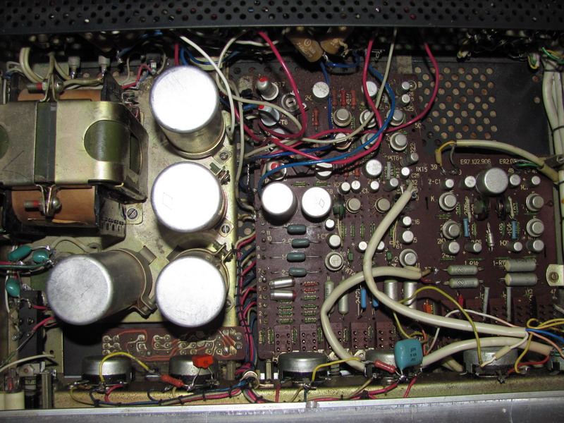 Собственно вот пациент. Самый первый усилок, с которым я имел дело =) Предыдущая поломка была связана с плохим охлаждением транзисторов и поэтому они просто сгорали. Во второй раз после поломки, уже не понес в ремонт, а заменил транзисторы. Когда включил не совсем обрадовался =) Вылетела искра и 2 (как я понял резистора каких-то необычных) вздулись и выкинули свои внутренности наружу =).