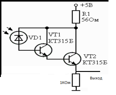 в качестве фотоприемника можно использовать фоторезистор при этом базу vt1 возможно понадобиться "подтянуть" на корпус резистор 10-100ком