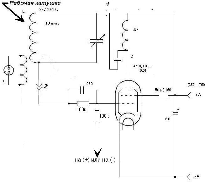 если зделал как в первой схеме показано, неонку лучше убери. лучше её через катушку связи, как в последней схеме показано
