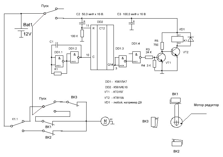 Здравствуйте , подсоветуйте схему таймера с выдержкой в 120 минут, для привода автоматического переворота яиц в инкубаторе,планирую использоваться двигатель с редуктором от дворников авто, то есть каждые два часа он включает двигатель и при достежении,скажем положения 1 - ВМТ(верхняя мертвая точка),выключает проходит опять 2часа включает ,доходит до положения 2 -НМТ (нижняя мертвая точка), и дальше по кругу
