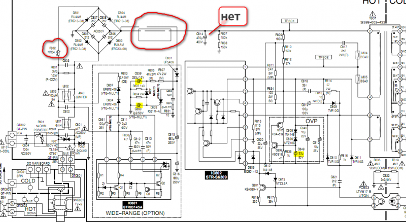 Кондёры 815,816 есть? На них есть напряжение? Они вместо того, которого нету. 814го, Наверное так. ТО, что обведено, в середине, должно быть перемычки, как включено зависит от модели.