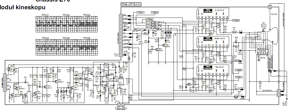 Телеки не чинил лет 15, так что не уверен, что смогу ткнуть пальцем в схему и сказать "вот она". Но она есть - 100%.