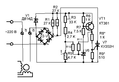 Схема будет работать так же, как и в описании по ссылке. с той лишь разницей, что при включении тиристора, напряжение со схемы снимется. Так будет с каждым полупериодом. Пока температура холодильника выше нормы. Если опустится ниже нормы, тлка открываться не будет, тиристор перестанет включать компрессор. Терморезистор типа ММТ-4.