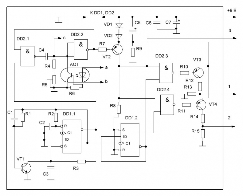 Триггер DD1.2 преобразует прямоугольные импульсы генератора в меандр, логические единички которого, элементами DD2.3, DD2.4 сравниваются с единичками транзистора VT2, а их длительность зависит от R4, R5, АОТ, и через транзисторы VT3, VT4, усиленные по току, управляют двухтактным преобразователем (выводы 1 и 2).