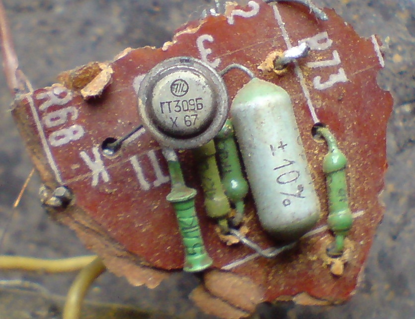 На моей схеме номиналы резисторов указаны, транзистор ГТ309Б. Общий вид монтажа на рисунке (без стержня и катушки).