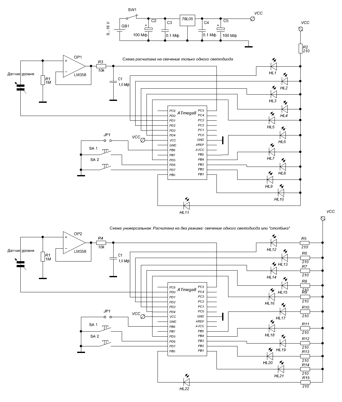 Верхняя схема "Выдает" питание на операционный усилитель, микроконтролер и светодиоды как первой так и второй схемы, 200 или 210 ом отвечают за яркость свечения светодиодов ну и естественно увеличат ток нагрузки МК хотя и незначиельно.