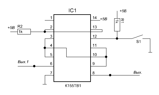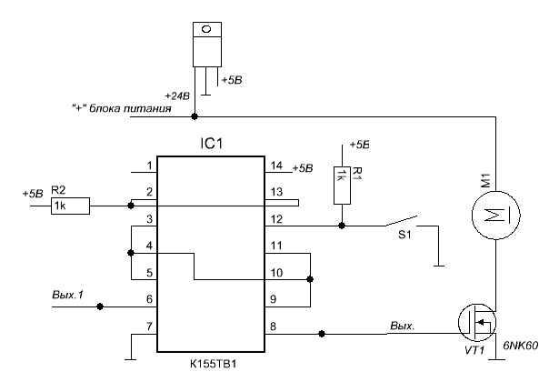 ec73, то есть схема приведенная вами - это схема, позволяющая по первому нажатию кнопки запустить мотор, по второму- остановить. Но, как я вижу, на R1 и R2, а так же на 14 вывод К155ТВ1 подается напряжение 5 вольт. Следовательно я должен пропустить свои 12-24V 3-5A через стабилизатор на 5V, раситанный на мой ток и напряжение, и подать напряжение 5V на R1, R2 и 14 вывод К155ТВ1? так?