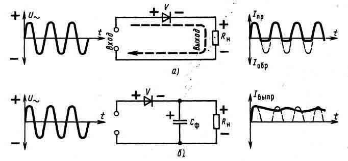 1) использование одного диода включенного последовательно в цепь переменного напряжения "срезает" одну полуволну. Тем самым ток становиться не переменный а пульсирующий в направлении одной полярности. Это называться однополупериодный выпрямитель. Действующие напряжение такого выпрямителя равно половине действующего значения переменного напряжения. Если использовать сглаживающий конденсатор данное напряжение можно повысить.