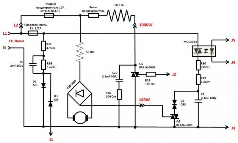 "Для питания двигателя я бы заменил R30 на подстроечник в 470 кОм и отрегулировал узел на выходное напряжение в 110 В."