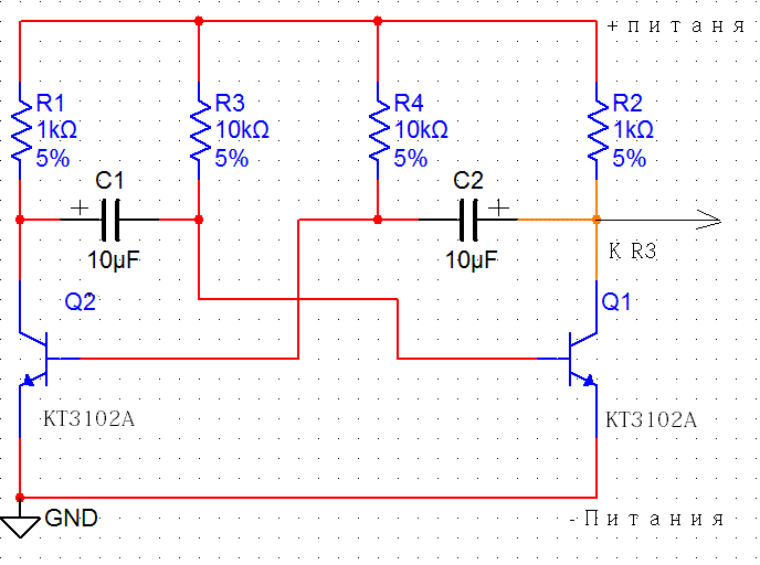 а вот схема простейшего мультивибратора для создания переодичности