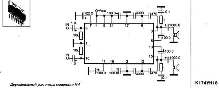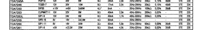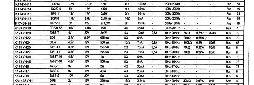 Тип корпуса;Минимальное напряжение питания; Максимальное напряжение питания; Максимальная выходная мощность; Сопротивление нагрузки; Минимальный ток потребления; Максимальный ток(может быть не указан, т.к. зависит от громкости и мощности); Рабочая частота; Входное сопротивление; Коэффициент нелинейных искажений; Коэффициент усиления; Страна производитель; Страница.