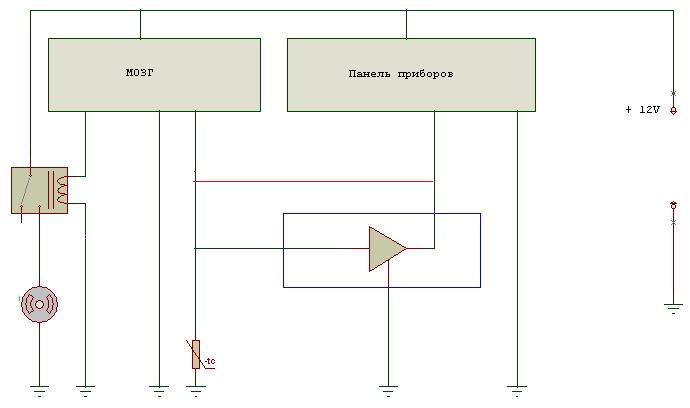 На других объемах движка используется 2 датчика: один на мозги, другой на приборку, а на моем движке - один датчик, общий. Я поставил приборку как раз от движка с двумя датчиками. Выглядит все как на рисунке. Красная мыка - штатная, убирается. В синей рамке - то, что нужно добавить