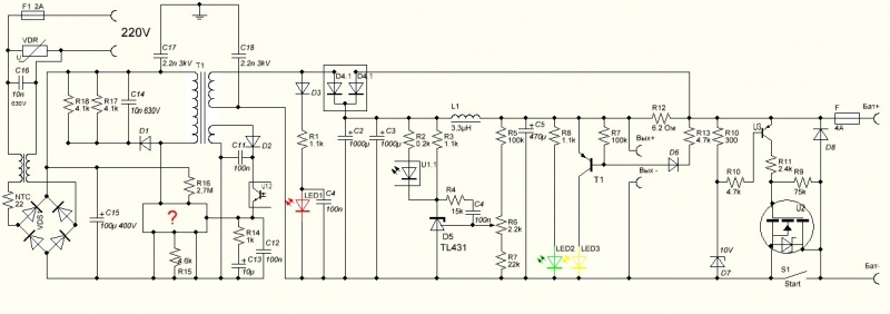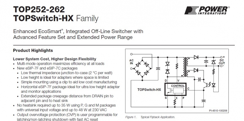 Попался девайс, хочу восстановить для себя. Предистория, после отъезда арендаторов в тумбочке стола нашёл блок непрерывного питания видеонаблюдения, фирма этим занималась, решил себе восстановить, уж очень компактный и малогабаритный но с хорошим током. При внешнем осмотре увидел разлетевшуюся в дребезги мокросборку в корпусе ТО-220-7С, название естественно определить нет возможности, схему срисовал с печатной платы, достоверность проверена неоднократно, схему прилагаю. Вопрос: "Какая микросхема?", Если как я понял TOP258YN, то будет ли она работать с такими номиналами обвязки? Или подскажите другую микросборку в таком корпусе для замены.