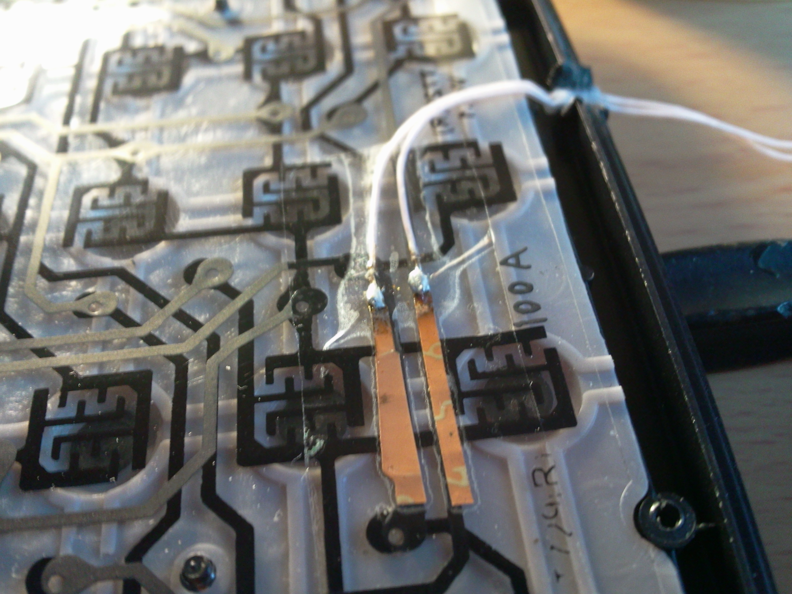 аккуратно отрезал кусочек скотча, к дорожкам припаял проволочки,