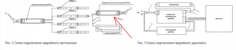 По схеме подключения аварийного светодиодного светильника видно, что есть дополнительный аккумуляторный блок. При отсутствии напряжении на кабеле 0, автоматически включается напряжение на кабеле А. При этом будет гореть один или два модулей в зависимости от исполнения.
