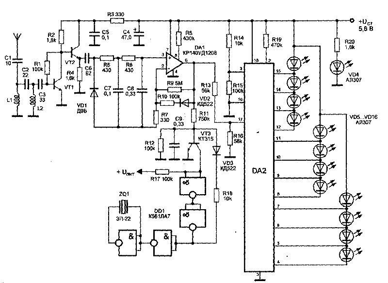 Основой светодиодного индикатора является микросхема DA2 типа КМ1003ПП2. Микросхема КМ1003ПП2 является пециализированной и выполняет функцию управления светодиодной шкалой, обеспечивая высвечивание столбика на шкале из 12 светодиодов, которые загораются поочередно при изменении входного напряжения от минимального до максимального значения. Яркость свечения светодиодов поддерживается постоянной. Входной сигнал, через делитель напряжения на резисторах R13, R16, поступает на вход микросхемы DA2 (вывод 17). На выводы 16 и 3 микросхемы DA2 подаются уровни опорного напряжения, определяющие, соответственно, минимальное (светодиоды не горят) и максимальное (горят все светодиоды) значения входного сигнала. Питается устройство от источника питания напряжением 5,6 В.Светодиод VD4 типа АЛ307 служит для индикации включения прибора.