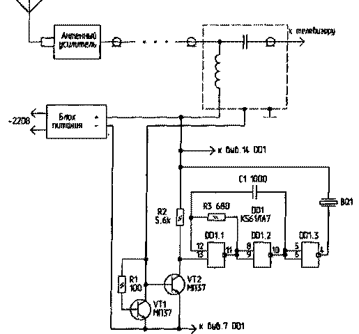 Включите блок питания антенного усилителя в сеть. От антенного штекера, ведущего к телевизору, отсоедините центральную жилу кабеля (она прикручивается винтом). При этом должен прозвучать тональный сигнал тревоги. При необходимости частоту тона можно изменить подбором емкости С1.