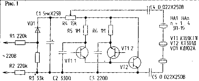 Нагрузка генераторов развязана от питающей сети гасящими сопротивлениями выпрямителей и малыми емкостями переходных конденсаторов. Устройства собраны в пластмассовых корпусах с внутренним размером 63х22х18мм. Пьезоке-рамические излучатели (от одного до четырех - в зависимости от количества стекол в оконной раме) наклеивают в центре стекла внутренних рам и присоединяют к генераторам тонким проводом. Излучатели могут быть соединены последовательно или параллельно-последовательно. Разговор в помещении при проведении переговоров нс должен быть громким, окна должны быть закрыты и зашторены плотными тканями.