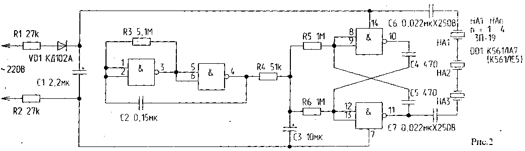 Генератор шума (рис.2) выполнен на основе микросхемы К561ЛА7 (либо К561ЛЕ5, микросхем серии К564). Устройство генерирует сигнал, частота которого "плавает" в области звуковых частот (речевого диапазона звуков). Для усложнения характера генерируемых сигналов питание генератора также не стабилизировано и на выходе выпрямителя присутствуют несглаженные пульсации. Нагрузкой генератора, как и в первом случае, являются пьезокерамические излучатели, например типа ЗП-19. Напряжения питания устройств не превышают паспортных значений используемых в схемах полупроводниковых приборов, в связи с чем возможна их длительная эксплуатация без отключения от сети.