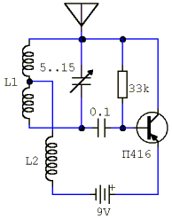 Georgy прислал новый девайс, который описал так - "Глушит любой ящик в радиусе десяти метров, если у него комнатная антенна, то он и сгореть может". Радует? Тогда поехали... Схема предназначена для целенаправленного глушения какого-либо одного телеканала. При указанных параметрах схемы вращением подстроечника можно настроить глушак на ОРТ, РТР, НТВ. Глушит любой ящик гарантированно на расстоянии до 10 метров. Если у соседа антенна типа "решетка" (или другая какая-нибудь активная антенна собственной установки), то, чтобы вывести ее из строя, достаточно спустить глушак на ниточке с верхнего этажа (крыши дома или своего балкона) так, чтобы он оказался на одном уровне с антенной. Если даже усилитель антенны выдержит, то у ящика могут сгореть входные цепи. Можно еще к центральной антенне подключить... Короче, соседям мало не покажется :). Ну, и немного о железках. Катушка индуктивности L1 содержит 10 витков, провод диаметром 1 мм на каркасе диаметром 10 мм (отвод от середины). Дроссель L2 наматывается на резистор МЛТ 0,5 номиналом 100 Ом, провод 0,1 мм и содержит 100 витков. При сборке следует учесть, что контурная катушка L1 не должна быть на одной оси с дросселем L2 и должна располагаться на расстоянии 2 см и более от нее. Антенна - кусок провода длиной 20-40 см. Настраивать лучше диэлектрической отверткой. Удачной сборки.