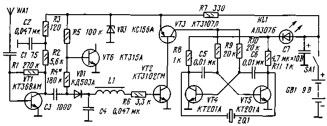 етодиода. Затем в "ближней зоне" проводят визуальный поиск местонахождения подслушивающего устройства. На диод VD1 через резистор R4 поступает напряжение смещения со стабилизатора напряжения R5, VD6, которое приоткрывает диод VD1 и транзистор VT2. Это повышает чувствительность детектора к малым уровням ВЧ сигналов. Резистор R4 подбирают так, чтобы светозвуковой сигнализатор находился на грани срабатывания сигнализатора. Как следствие, даже очень небольшая добавка напряжения, возникающая при детектировании исследуемого сигнала, открывает транзисторы VT2, VT3,запуская мультивибратор. Недостаток такого решения - заметная нетермочувствительность сигнализатора. Ее можно устранить, подобрав R4 так, чтобы сигнализатор не срабатывал самопроизвольно в выбранном диапазоне температуры. Облегчит эту процедуру применение в качестве VT2 транзистора с очень малым обратным током. Диод VD1 можно заменить на КД503Б, КД509А, КД512А, КД407А или КД409А. Стабилитрон VD3 - любой с напряжением стабилизации 5...7 В. Транзистор VT1 - КТ368 с любым буквенным индексом в любом корпусе либо другой высокочастотный, например, КТ3101А-2, КТ3120А, КТ3124. Транзистор VT2 - КТ3102 с индексами Г, Е. Заменять его на другие не стоит, так как он имеет очень малый начальный ток коллектор-эмиттер - менее 0,05 мкА. Транзистор VT3 можно заменить на КТ3107 с индексами К, Д. Вместо транзисторов VT4 и VT5 допускается использовать любые кремниевые маломощные соответствующей структуры с подходящей цоколевкой. Лишь бы обратный ток коллектора был достаточно мал, чтобы мультивибратор не самовозбуждался. По этой причине нельзя применять германиевые транзисторы. Чем больше коэффициент передачи тока каждого транзистора, тем выше чувствительность всего устройства. Автор использовал пьезоизлучатель ZQ1 от электронных часов "Монтана", но здесь подойдут и другие. Дроссель L1 должен иметь индуктивность 1...2 мГн. В авторском варианте он содержит 180 витков провода ПЭЛШО-0,12 на кольце от импульсного трансформатора ТИ-18. Выключатель SA1 - ПД9-2. Антенна WA1 - телескопическая от импортной магнитолы общей длиной 32 см. Слишком длинную антенну использовать не следует. Налаживание сигнализатора начинают с установки напряжения смещения на диоде VD1. Для этого конденсатор СЗ нужно временно отключить. Вместо резистора R4 временно устанавливают переменный сопротивлением 560 кОм. Вращая его движок, добиваются исчезновения звука. Если теперь поднести устройство к лампе на-каливания или вынести на солнечный свет, то сигнализатор начнет слабо пищать, набирая громкость с нагревом. Затем измеряют сопротивление переменного резистора и устанавливают резистор R4 с сопротивлением, в полтора раза большим. Это обеспечит работоспособность сигнализатора радиоизлучения в приемлемом диапазоне температуры. Усиление УРЧ регулируют подбором резистора R2.