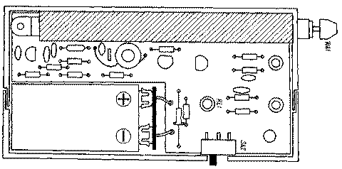 Корпус прибора - коробка для слайдов. Расположение элементов в корпусе показано на рис. 2. В торце коробки делают отверстие по диаметру самого толстого звена телескопической антенны. На это звено натягивают отрезок резиновой трубки, размоченной в толуоле. Длина трубки должна немного превышать длину коробки. После испарения толуола резиновая трубка плотно приклеится к антенне. Резиновую трубку обрезают так, чтобы при установке антенны в корпус она, сжавшись, плотно удерживала антенну. Плату вставляют под резиновую трубку. На корпусе снаружи укрепляют полоску медной фольги и соединяют ее с общим проводом. На начальном этапе поиска "жучка" следует касаться фольги большим пальцем руки. В этом случае ваше тело играет роль противовеса, что повышает чувствительность прибора. При "ближнем" поиске можно палец от фольги убрать. Это понизит чувствительность прибора и повысит точность определения местонахождения "жучка".
