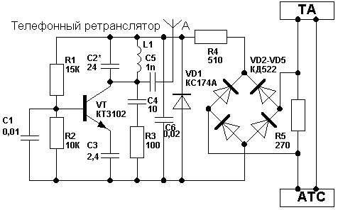 При снятии трубки и вызове абонента на резисторе R5 падает напряжение (3...4 В), достаточное для питания простого передатчика. Подбором резистора R5 можно получить и большее напряжение, но при этом будет ощутимо снижение громкости переговоров на этом ТА, что может привести к рассекречиванию "жучка". На транзисторе VT2 собран генератор по схеме емкостной трехточки. Выходной контур L1 C2 можно настроить на требуемый диапазон частот изменением емкости конденсатора С2 или числа витков катушки L1.Катушка L1-8 витков провода ПЭЛ 0,5...0,7, намотанных на диаметре 4 мм. Параметрический стабилизатор на стабилитроне VD1 ограничивает подаваемое на транзистор VT1 напряжение питания.