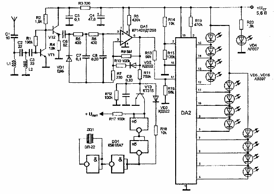 Основой светодиодного индикатора является микросхема DA2 типа КМ1003ПП2. Микросхема КМ1003ПП2 является специализированной и выполняет функцию управления светодиодной шкалой, обеспечивая высвечивание столбика на шкале из 12 светодиодов, которые загораются поочередно при изменении входного напряжения от минимального до максимального значения. Яркость свечения светодиодов поддерживается постоянной. Входной сигнал, через делитель напряжения на резисторах R13, R16, поступает на вход микросхемы DA2 (вывод 17). На выводы 16 и 3 микросхемы DA2 подаются уровни опорного напряжения, определяющие, соответственно, минимальное (светодиоды не горят) и максимальное (горят все светодиоды) Значения входного сигнала. Питается устройство от источника питания напряжением 5,6 В. Светодиод VD4 типа АЛ307 служит для индикации включения прибора.