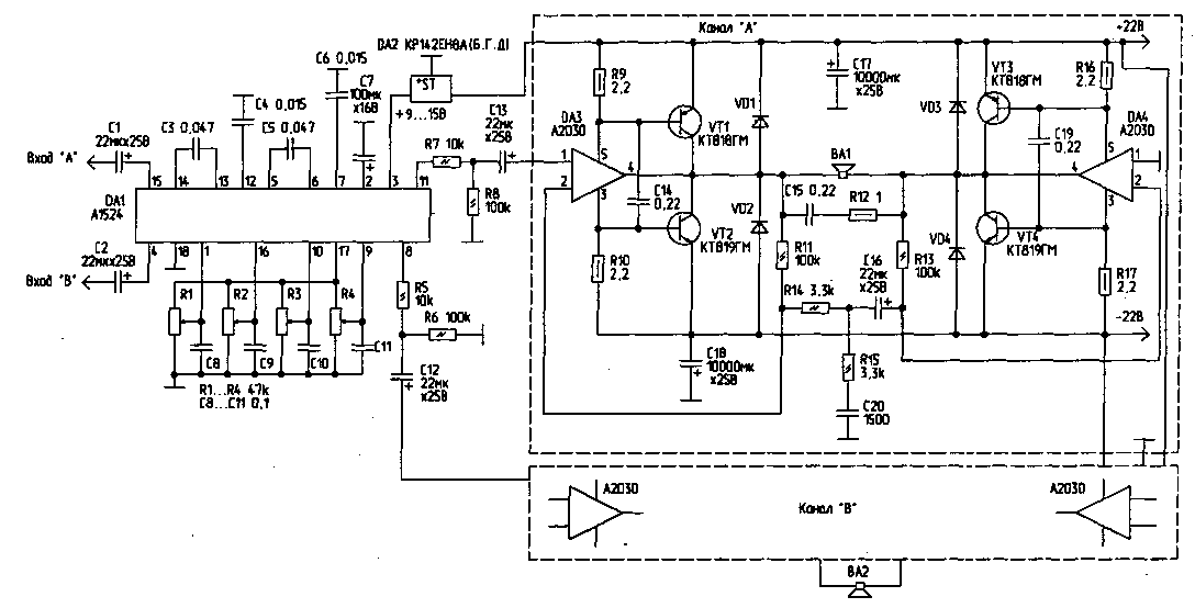Микросхема А2030, на мой взгляд, является наилучшим из существующих на данный момент интегральных усилителей мощности. По таким важнейшим показателям как выходная мощность и коэффициент гармоник он далеко обгоняет другие имеющиеся на рынке интегральные усилители. Предлагаемый стереофонический УЗЧ на базе А2030 обладает низким коэффициентом гармоник и большой выходной мощностью.