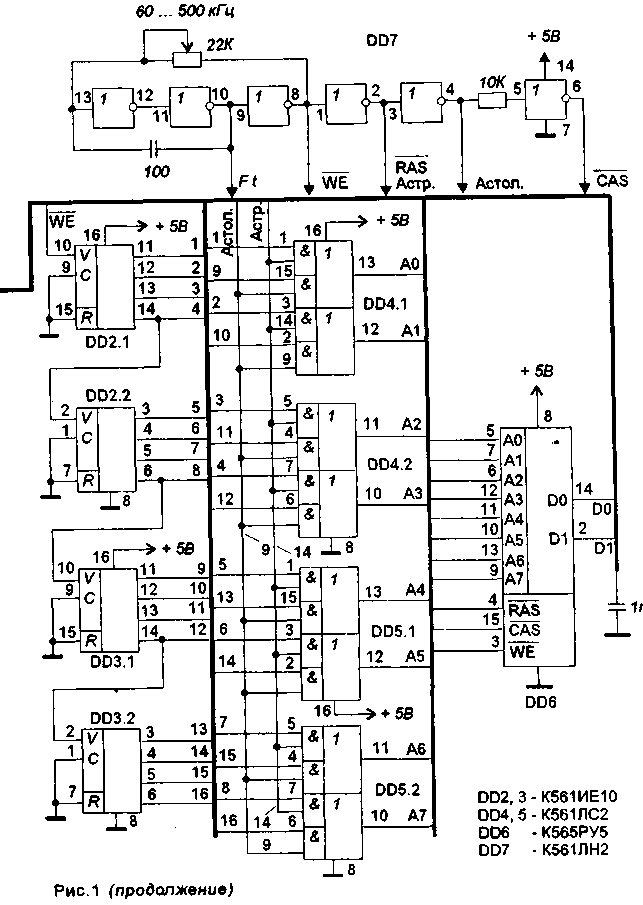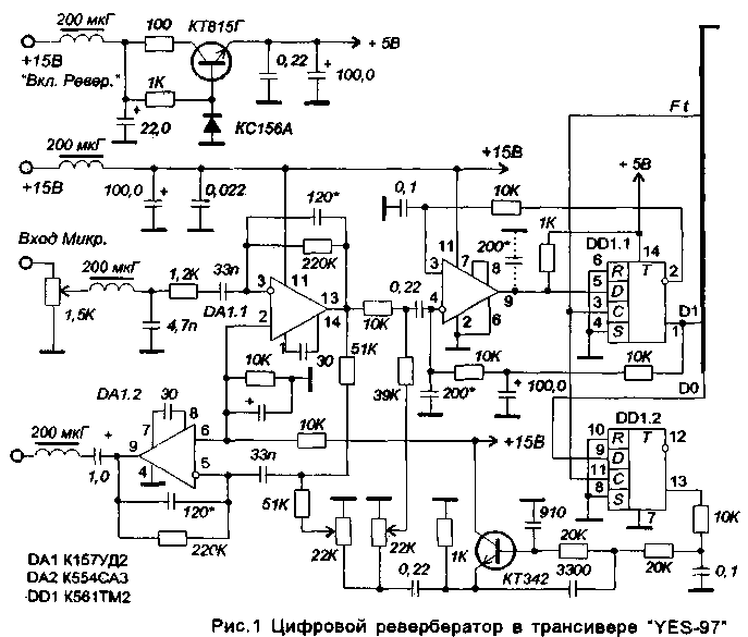 Ревербератор, приведенный на рис.1, состоит из микрофонного и выходного суммирующего усилителей, собранных на сдвоенном операционном усилителе К157УД2, аналого-цифрового (АЦП) и цифро-аналогового (ЦАП) преобразователей - микросхемы К554САЗ и К561ТМ2 и узла задержки, выполненного на микросхеме К565РУ5. В схеме кодировки адресов применяются микросхемы К561ИЕ10иК561ПС2.