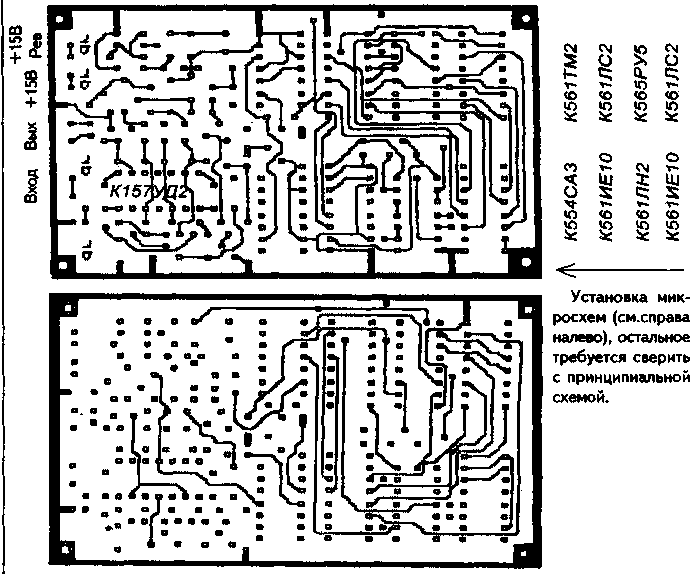 Резистором R1, изменяя частоту тактового генератора, можно регулировать время задержки. Резисторами R2 и R3 подбирается глубина и уровень реверберации, соответственно. Манипулируя этими резисторами, оптимизируется работа всего ревербератора. Конденсаторами, обозначенными (*), необходимо добиться наилучшего качества сигнала по минимуму шумов. Большие искажения в задержанном сигнале свидетельствуют о неисправной микросхеме в узле кодировки адресов. Ревербератор собран на печатной плате из двухстороннего стеклотекстолита 130х58 мм. После сборки и настройки плата помещается в металлическую экранирующую коробочку соответствующего размера.