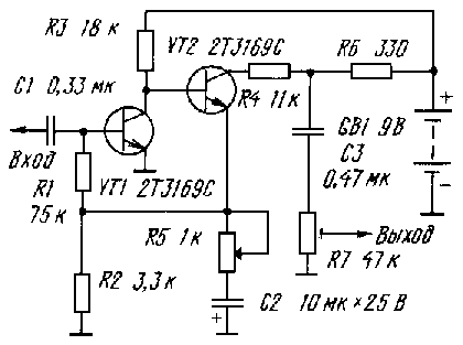 На рисунке показана простая схема реализации эффекта "дистошн". В ней используются широко распространенные малошумящие транзисторы. Устройство представляет собой двухкаскадный усилитель с гальванической связью и большим коэффициентом передачи. Благодаря этому даже при номинальном сигнале на входе наступает его симметричное двустороннее ограничение на выходе (эффект "дистошн"). Глубину эффекта можно плавно регулировать изменением коэффициента передачи каскада переменным резистором R5, включенным в цепь отрицательной обратной связи.