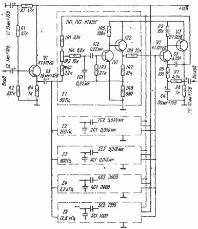 Устройство состоит из входного эмиттерного повторителя на транзисторе V1, пяти активных полосовых фильтров. Z1-Z5 (на схеме показан один из них - Z1) и двухкаскадного усилителя на транзисторах V2, V3.