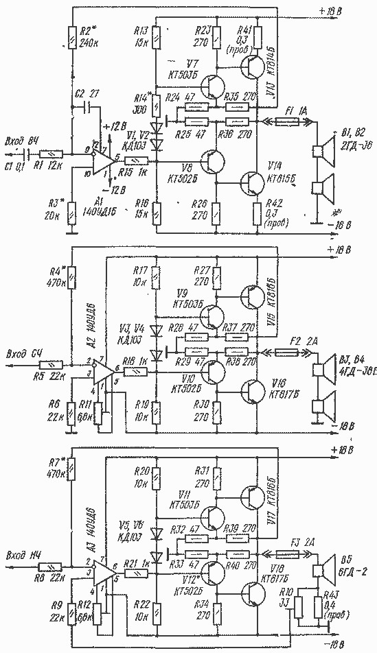 Кроме указанных на схеме, в усилителях СЧ и НЧ можно использовать ОУ К140УД6А, КН0УД6Б, К140УД8А, К140УД8Б, К553УД1 Комплементарные парытранзисторовКТ502Б, КТ503Б можно заменить парами КТ502Г, КТ503Г; КТ502В, КТ503В, а также (в усилителе ВЧ) парой транзисторов КТ361Е, КТ315Е. Статические коэффициенты передачи тока заменяющих транзисторов должны быть не менее 40. Для получения малых нелинейных искажений пары транзисторов выходных каскадов рекомендуется подобрать по коэффициенту h21э с отклонением не более ╠ 10 % (V7, V8 и V13, V14) и ╠ 20 % (все остальные).