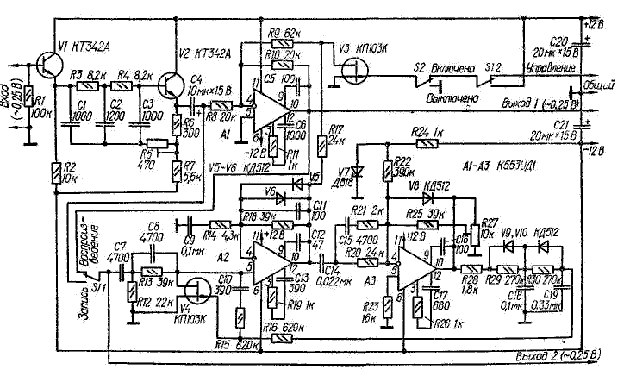 Устройство (рис. IV 23) состоит из входного эмиттерного повторителя (VI), активного режекторного фильтра (V2), подавляющего поднесущую частоту (31,25 кГц) при записи стереофонических передач; сумматора (А1), канала регулирования, канала формирования управляющего сигнала и электронного выключателя (V3), который в случае необходимости можно заменить обычным механическим выключателем В свою очередь, канал регулирования состоит из фильтра верхних частот R12C7 с постоянной времени т = 106 мке, управляемого аттенюатора R13V4 и усилителя-ограничителя на ОУ А2 и диодах V5, V6, а канал формирования управляющего сигнала - из усилителя на ОУ A3 и выпрямителя на диодах V9, V10.