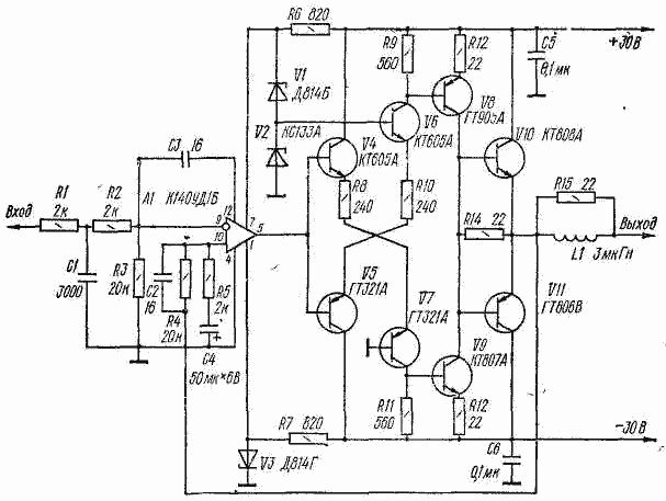 Для работы в этом усилителе пригоден операционный усилитель с коэффициентом усиления напряжения не менее 2000. Транзисторы оконечного каскада желательно подобрать с одинаковыми коэффициентами передачи тока (h21э >50). Вместо транзисторов ГТ321А в усилителе можно применить транзисторы КТ626 (с буквенными индексами А, Б, В), вместо ГТ905А и ГТ806В -соответственно КТ814Г и КТ816Г. Катушка L1 (30 витков) намотана в два слоя проводом ПЭВ-2-1,0 на каркасе диаметром 7 и длиной 25 мм.