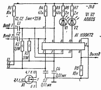 Два из них использованы для коммутации сигналов, поданных на входы 1, 2, два других - для коммутации светодиодов V1 и V2, индицирующих состояние устройства. Коммутатор сигналов выполнен по схеме триггера с автоматическим смещением. Коммутируемые сигналы подаются через конденсаторы С1 и С2 на стоки полевых транзисторов, выбранный сигнал снимается со стока. При касании сенсорных контактов Е1 и Е2 на выход коммутатора подается сигнал со входа 2 (зажигается светодиод V1), при касании контактов Е2 и ЕЗ - со входа 1 (зажигается светодиод V2). Если необходимо, чтобы с включением питания коммутатор устанавливался в определенное состояние, емкость конденсатора (СЗ или С4), соединенного с затвором транзистора, который должен остаться закрытым, надо увеличить в 1,5. .2 раза по сравнению с указанной на схеме. Для получения коэффициента передачи, близкого к единице, выходные сопротивления источников сигнала не должны превышать 1 - 2 кОм.