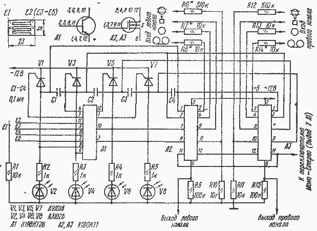 Как видно из схемы, переключатель выполнен на транзисторной сборке А1, четырех тринисторах (VI, V3, V5, V7) и двух пятиканальных коммутаторах К190КТ1. Сенсорные контакты Е2-Е5 соединены с базами транзисторов сборки А1. В исходном состоянии все транзисторы этой сборки, тринисторы и электронные ключи коммутаторов А2, A3 закрыты, и светодиоды V2, V4, V6, V8 не светятся. При касании сенсорных контактов Е1 и Е2 транзистор сборки А1, база которого (вывод 11) соединена с контактом Е2, открывается, и импульс его коллекторного тока заставляет открыться тринистор V5. В результате зажигается светодиод V6, на затворы соответствующих транзисторов микросхем А2, A3 (выводы 7) подается напряжение отрицательной полярности, и они открываются, соединяя линейный выход приемника со входом усилителя ЗЧ. При касании другой пары контактов коммутатор работает аналогично, при этом ранее открытый тринистор закрывается под действием напряжений на обкладках соединенных с его анодом конденсаторов С1-С4 Для уменьшения проникания на выход сигналов отключенных источников программ на подложки транзисторов микросхем А2, A3 (выводы 5) подано положительное напряжение