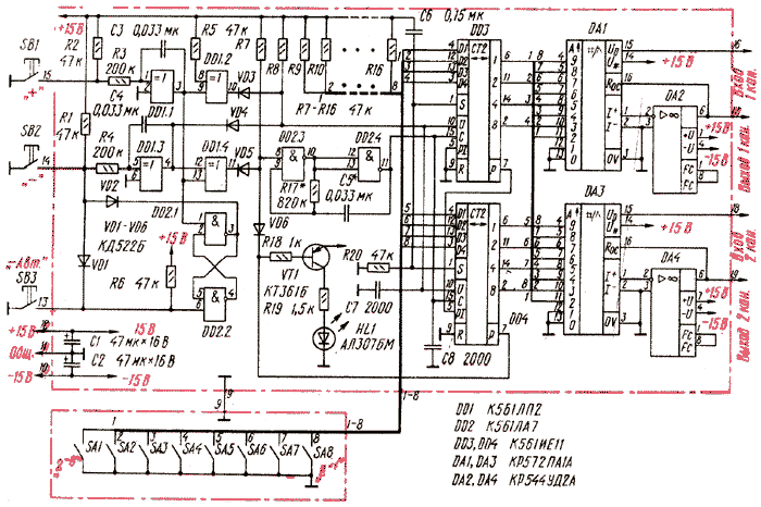 При разработке предлагаемого читателям устройства автор стремился создать электронный регулятор громкости, по техническим характеристикам соответствующий аналогичным регуляторам с использованием ЦАП, но содержащий минимальное число дефицитных радиоэлементов. Для его реализации потребовалось всего восемь микросхем, однако диапазон выполняемых им функций достаточно широк. Это увеличение и уменьшение громкости во время нажатия на соответствующие кнопки "+" и "-", автоматическое плавное снижение громкости до нуля при кратковременном нажатии на кнопку "- Авт.", возможность прерывания этого снижения кратковременным нажатием на кнопку "+", установка желаемого заранее заданного уровня громкости при включении питания и, наконец, светодиодная индикация наибольшего и наименьшего коэффициента передачи регулятора громкости. Регулятор имеет следующие технические характеристики: число каналов регулирования - 2; диапазон регулирования громкости - не менее 60 дБ; число шагов дискретизации - 256; ток, потребляемый от источника напряжением +15 (-15) В,- не более 10 (6) мА. Характеристика регулирования линейная. Регулятор может использоваться в простых стереофонических усилителях ЗЧ и звуковоспроизводящих стереокомплексах. Все изменения громкости происходят в обоих каналах синхронно. Раздельная регулировка громкости по каналам требует неоправданного усложнения схемы и к тому же снижает удобство пользования регулятором громкости. По этой же причине было решено отказаться от пошагового регулирования громкости: при 256 дискретах регулирования каждая отдельная ступенька громкости едва ли различима, а реализация такого режима требует дополнительного усложнения схемы. Поэтому функцию выравнивания громкости в стереоканалах целесообразно возложить на регулятор стереобаланса, а пошаговый режим регулирования громкости так или иначе способно обеспечить данное устройство при кратковременном нажатии на кнопку "+" или "-". Принципиальная схема электронного регулятора громкости приведена на рис.1. Он состоит из узла управления и преобразователя "Код - громкость". В узел управления входят: устройство подавления дребезга кнопок SB1-SB3 на элементах DD1.1, DD1.3 микросхемы DD1, формирователь сигнала направления счета на элементе DD1.2 микросхемы DD1 и диодах VD3, VD4, триггер автоматического снижения громкости на элементах DD2.1, DD2.2 микросхемы DD2, дешифратор состояний кнопок SB1-SB3 и триггера снижения громкости на элементе DD1.4 микросхемы DD1, генератор импульсов на элементах DD2.3, DD2.4 микросхемы DD2 и реверсивный двоичный восьмиразрядный счетчик с предустановкой на микросхемах DD3, DD4. Транзистор VT1 и светодиод HL1 образуют устройство индикации крайних состояний счетчика, или, что то же самое, максимального и минимального коэффициента передачи регулятора громкости. Сигналы кодовых комбинаций с двоичного счетчика поступают на преобразователь "Код - громкость", выполненный по стандартной схеме ЦАП на микросхемах DA1, DA2 и DA3, DA4. Работает регулятор громкости следующим образом. При включении питания на резисторе R20 возникает положительный импульс напряжения, вызванный протекающим через него током зарядки конденсаторе С6. Под действием этого импульса информация с входов предустановки двоичного реверсивного счетчика переписывается на его выходы и, таким образом, на цифровых вх