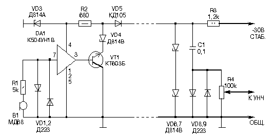 Микрофон В1 подключен к входу DA1 через резистор R1. Это позволяет не выводя микросборку из строя подсоединять и даже припаивать микрофонный кабель (короткий) к схеме. Защитой входа от перенапряжений служат диоды VD1,2. Усиленный DA1 сигнал подводится к базе VT1, включенного эмиттерным повторителем. корпуса обоих усилительных элементов соединены с "корпусом" устройства, что удобно при монтаже. С эмиттера VT1 усиленный сигнал подается в линию. Резистор R2 и стабилитрона обеспечивают питание микросборки, a стабилитрон VD4 необходимо для согласования потенциалов. Напомним, что сопротивление стабилитронов в открытом состоянии для переменного сигнала (т.н. дифференциальное сопротивление) небольшое, намного меньше сопротивления постоянному току. Диод VD6 служит для защиты при перепутывании полярности проводов (просто не будет звука). В конце линии вблизи УНЧ (может даже вмонтированный в УНЧ) находится второй блок. Питание в линию подается через R3. Переменная (звуковая) часть сигнала через С1 проходит к регулятору громкости R4. Диоды VD6, VD9 ограничивают сигнал в моменты коммутации, а также при замыкании или обрывах линии. Стабилитроны VD6, VD7 открываются только в случае обрыва линии и шунтируют переменную составляющую наводки на линию (в УНЧ проходит только короткий щелчок).