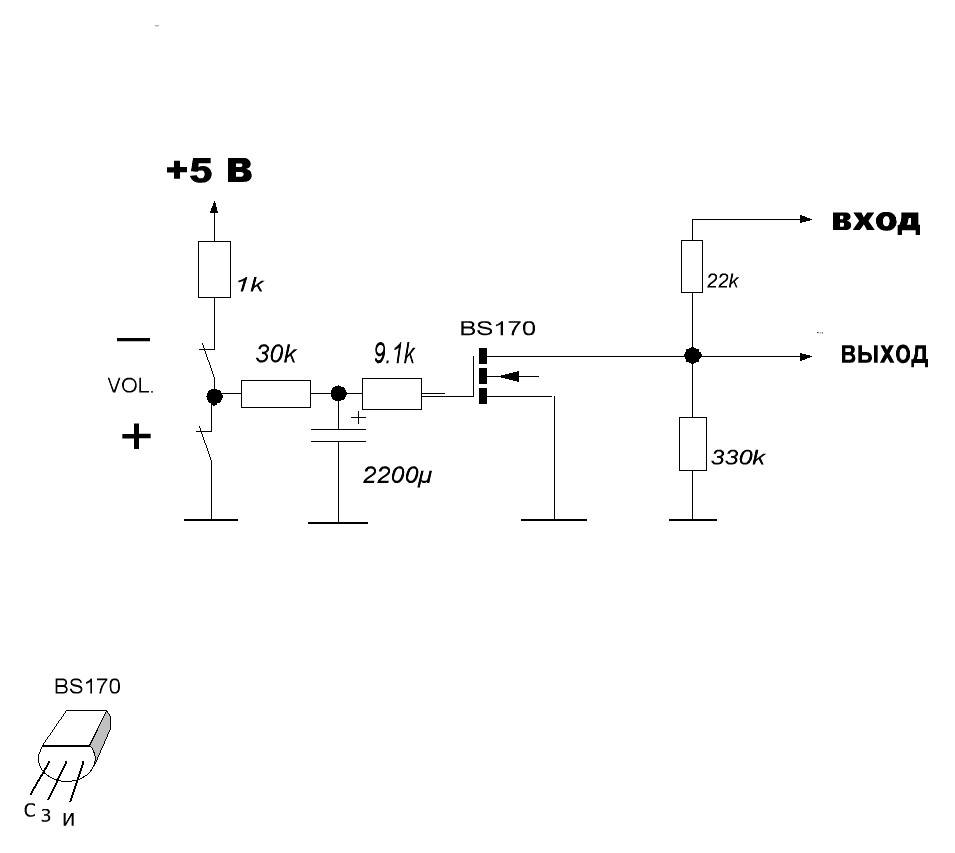 Он работает аналогично цифровым регуляторам громкости,помнит уровень громкости после выключения питания,его потребляемый ток(только при нажатии на кнопку "-")не более 0,5 мА!