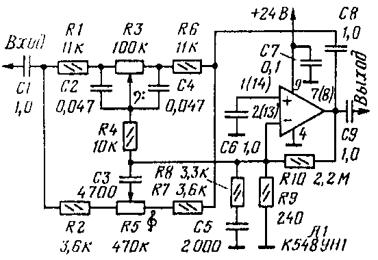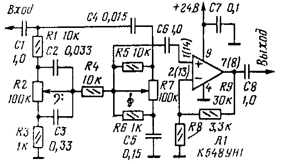 Диапазон регулирования тембра на частотах 40 и 16 000 Гц первого из устройств +/-15 дБ, второго - не менее +/- 12 дБ. Коэффициент передачи обоих устройств при установке движков резисторов в среднее положение равен 1, неравномерность АЧХ в этом положении движков зависит от отклонения параметров элементов от указанных на схеме и, если это отклонение не превышает +/-5%, составляет примерно +/-1 дБ в диапазоне частот 20...20 000 Гц. Достоинство активого регулятора тембра - возможность использования переменных резисторов группы А (в регуляторе по схеме на рис. 5 они должны быть группы В). Для нормальной работы обоих устройств выходное сопротивление предшествующего каскада должно быть небольшим (не более 2 кОм). Рассмотренными примерами, естественно, не исчерпываются возможности применения микросхемы К548УН1 в аппаратуре записи и воспроизведения звука. С неменьшим успехом ее можно использовать в микшерских пультах, активных фильтрах, многополосных регуляторах тембра и т. д.