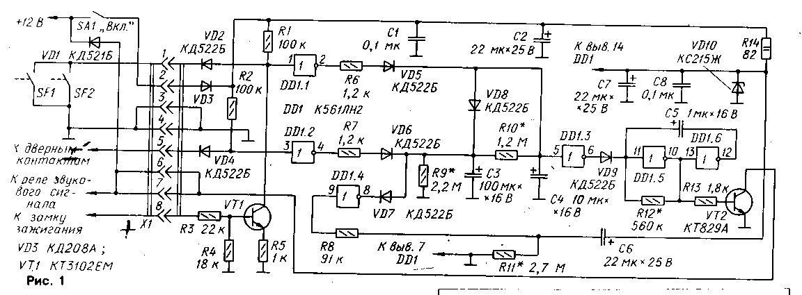 Если теперь открыть крышку багажника или капот, замкнутся контакты SF1 <ли sf2, на выходе инвертора dd1.1 возникнет высокий уровень и начнется зарядка конденсатора С4 через резистор r6 и диод vd5, а также конденсатора СЗ через диод vd8. К зарядке этих конденсаторов приведет и включение зажигания; при этом откроется транзистор vt1, обеспечивая низкий уровень на входе инвертора dd1.1.