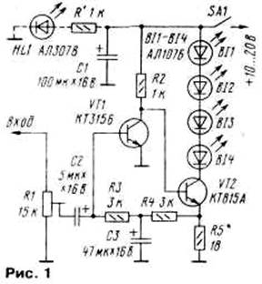 При отсутствии входного сигнала звукового сопровождения через излучающие диоды протекает ток покоя — примерно 40...50 мА. При подаче звукового сигнала ток через диоды будет изменяться, значит, будет меняться и излучаемая ими мощность — излучение окажется промодулированным.